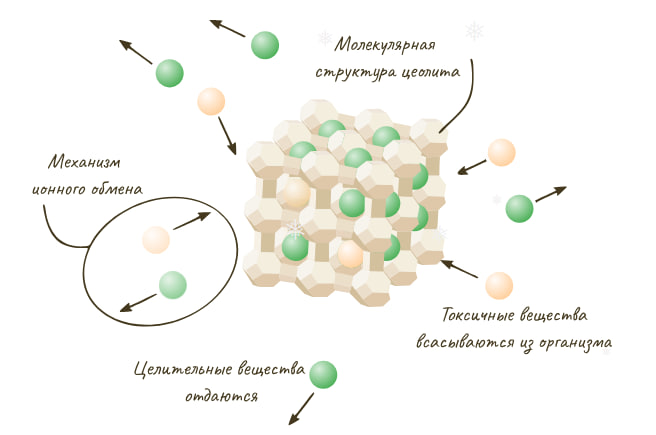 Попадая в организм человека через пищеварительную систему, цеолит действует как сорбент, поглощающий вредные соединения, а также как донор полезных элементов, находящихся в порах его кристаллической решетки: кальция, калия, магния.